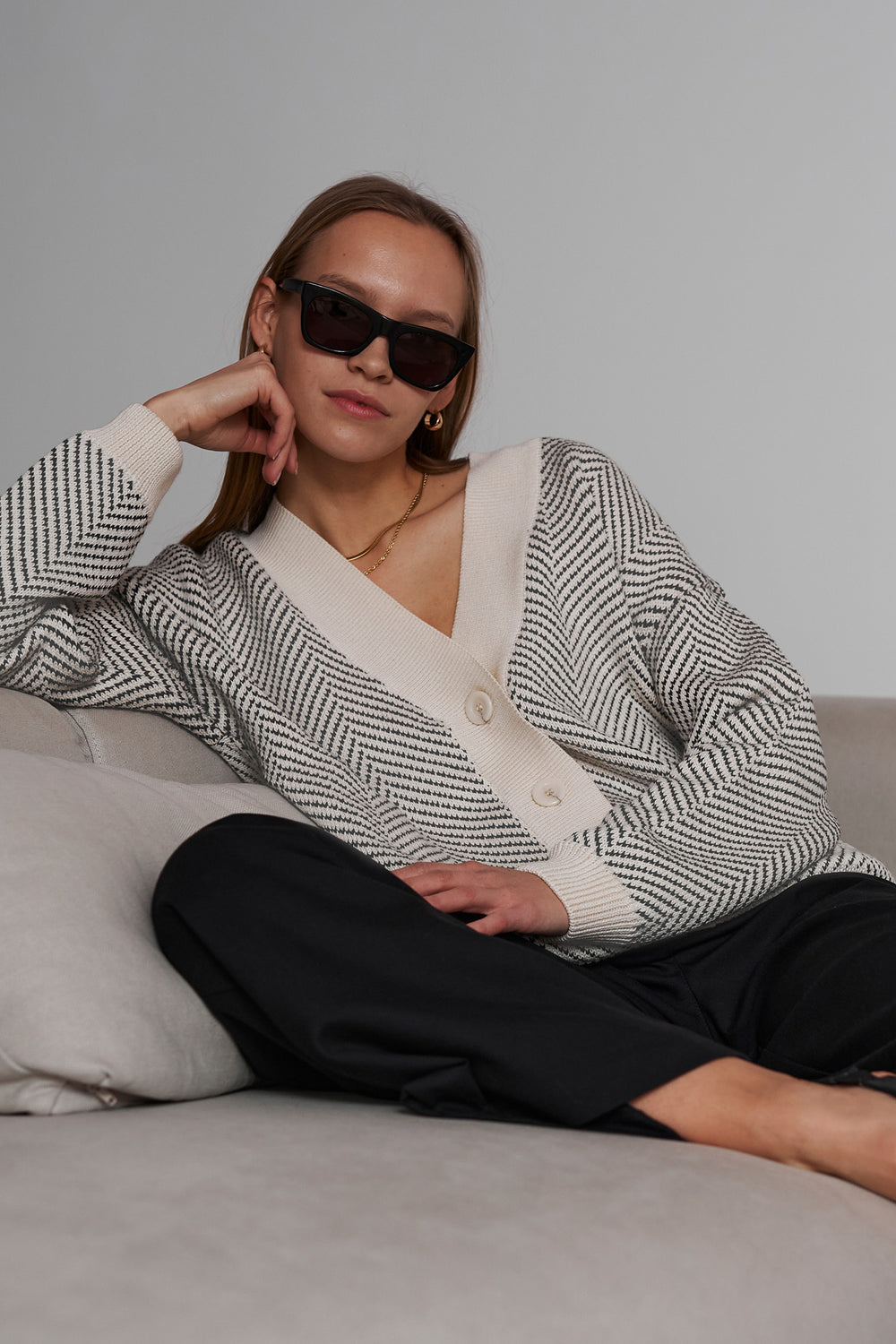 "I'm in love with quality and sophisticated pattern of this sweater. It has a bit oversize silhouette and looks great both skirt or jeans."